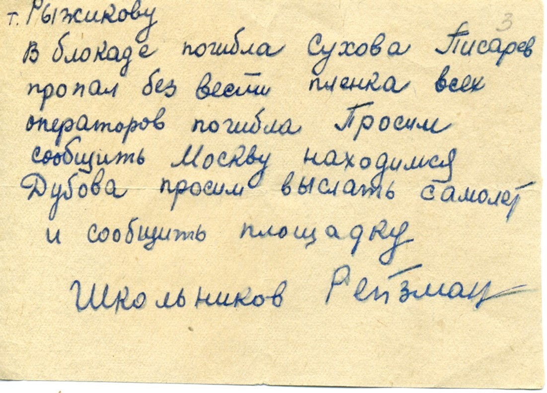 Оригинал этой записки хранится в Музее мемориального комплекса «Прорыв» в белорусском городке Ушачи. Приводит этот текст в своей дополненной и переработанной автобиографии «Сквозь огонь и стужу» и сам Школьников. И, что интересно, приводит его также в значительно отредактированном виде: «В блокаде погибли Мария Сухова и Николай Писарев. Пленка операторов при нас. Просим сообщить в Москву».