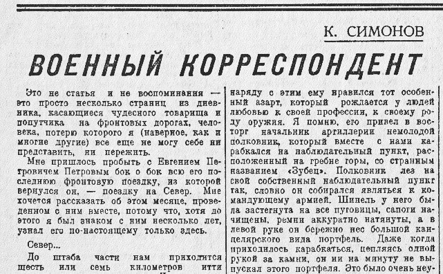Прежде всех других регалий в биографии Евгения Петрова сказано: «Соавтор Ильи Ильфа». Ильф и Петров написали знаменитые «12 стульев», «Золотого теленка», «Одноэтажную Америку». Их даже называли одним писателем с четырьмя глазами. Однако Ильф умер в 1937 году, и Петров остался один. С началом Великой Отечественной войны он пошел работать фронтовым корреспондентом. О том, каким Петров был человеком и каким стал военкором, рассказывает проект «Фронтовая редакция».