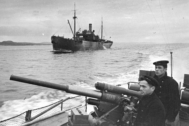 Катер «морской охотник» Северного флота сопровождает транспорт с грузом на одну из советских баз. Автор фото – Евгений Халдей