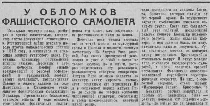 Уже 5 июля 1941-го в газете «Ленинградская правда» появляется статья Лавренёва под заголовком «У обломков фашистского самолёта». Название обещает очерк о героической обороне советских бойцов против превосходящих сил врага, но статья, помимо этого, оказывается ярким портретом типичного солдата фашистской Германии: