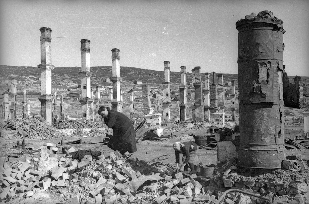 Летом 1942-го года Мурманск подвергся массированной бомбардировке. На деревянный город были сброшены десятки тысяч зажигательных и фугасных бомб. От домов остались только печные трубы – их частокол и запечатлел Евгений Халдей в своем снимке из разбомбленного города. И пожилую женщину, лишившуюся жилища.
