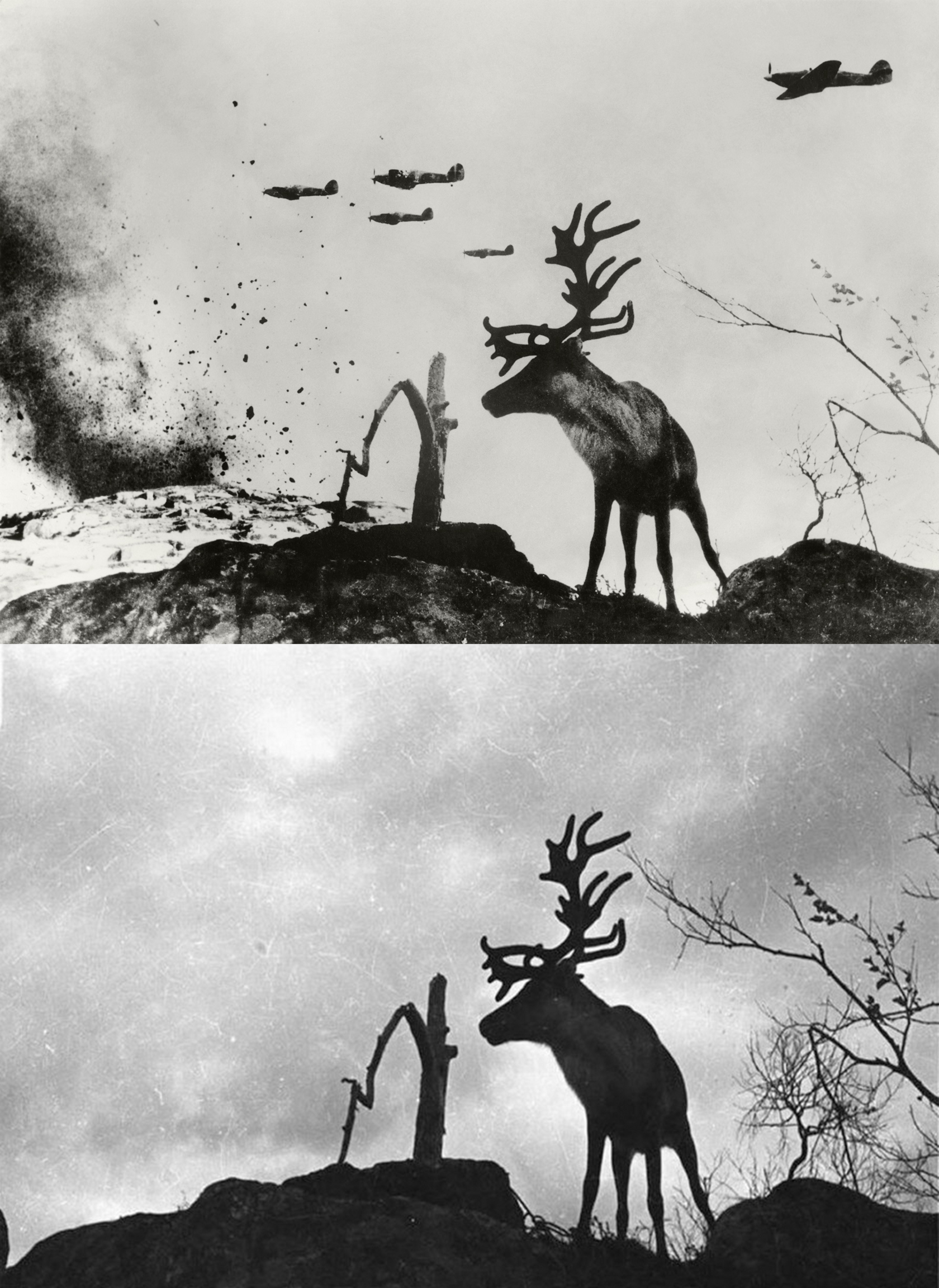 Фотография с оленем сделана во время боев за Мурманск. Контуженый зверь вышел к людям и набрел на траншеи наших позиций. И попал в объектив Халдея, который позже добавил фотографии драматизма, совместив с другим снимком путем мультиэкспозиции (это еще до появления фотошопа!), где разрывается бомба и летят самолеты.